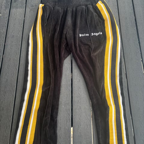 Palm Angels joggingbukser til herre i størrelse XL. Bukserne er grønne med hvide sidestriber og har Palm Angels-logo på benet. Fremstillet i polyester med elastisk talje og sidelommer. Velegnede som afslappede bukser eller træningsbukser.
