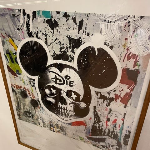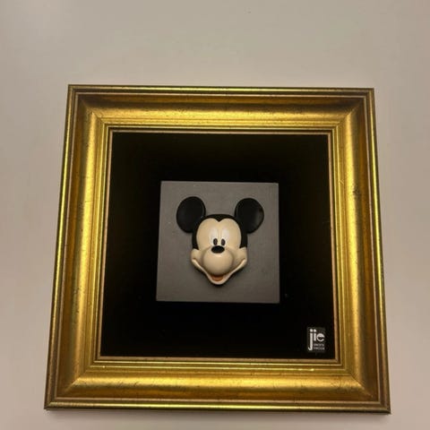 Mickey Mouse vægkunst med farverigt motiv. Billedet viser en tegneseriefigur på en abstrakt, flerfarvet baggrund med dominerende gule og grønne nuancer. Leveres i sort ramme, klar til ophængning på væg. Velegnet som dekoration i stue, værelse eller kontor.