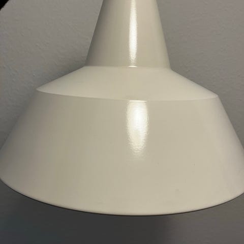 Hvid pendel / loftlampe metal. Original Lyskær model 4287. Retro lampe med fatning og hvid ledning Dia: 35 cm. H: 24 cm. Værkstedslampe. Brugt stand, få brugsmærker.