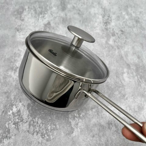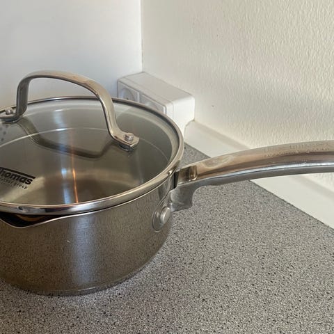 lille kacerola med låg rustfri stål str. H.9 x 17 cm. i Ø - brugte med super god stand, Egnet til alle varmekilder også INDUKTION SYSTEM. mærke Raadvad , kan hentes for 30 kr.