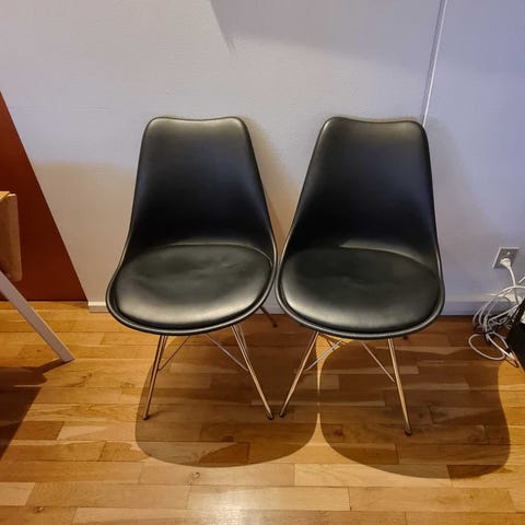 Stolene står i flot stand – nærmest som nye. Det er en elegant og moderne stol med en ergonomisk skal i blank sort finish og stel i flot krom. Et unikt "space age" udtryk, der passer perfekt til det moderne hjem.