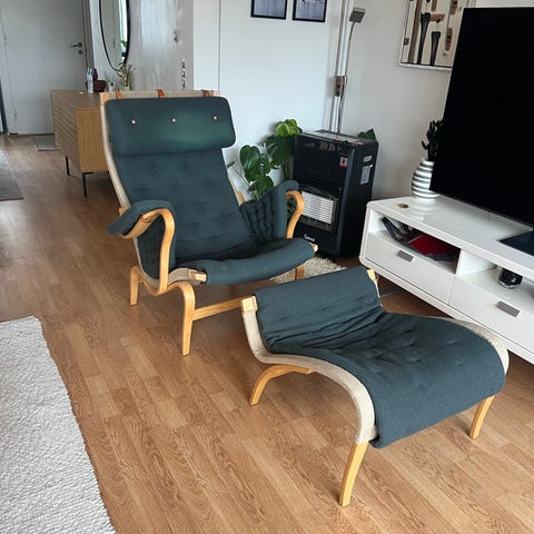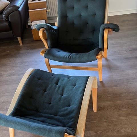 DUX Bruno Mathsson Pernilla 69 lænestol med formspændt træstel i lakeret bøg og polstret hynde i grøn nubuck/ruskind. Stoffet er jævnt falmet. Stolen har højt ryglæn, aftagelige armlænspuder og nakkestøtte. En af de tre stropper i nakkestøtten er revnet - se foto. Stolen er i vældig god stand, ingen revner eller pletter på canvas, og alle samlinger/limninger i stellet er intakt. Hynden er aftagelig. Egnet som loungestol eller læsestol i stue eller opholdsrum. Stolen står i Esbjerg.