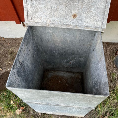Stor galvaniseret spand med låg og håndtag. Kan bruges til brænde, aske og diverse opbevaring. Klassisk rund form, højde 38 cm og diameter 33 cm.
