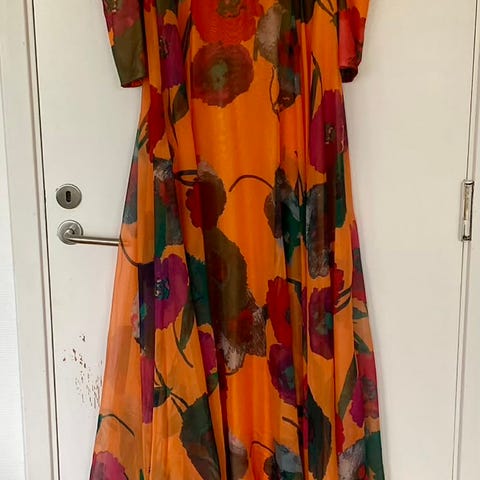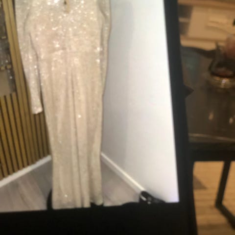 Brugt en enkelt gang , helt lang selskabskjole .Sort med hvide perler på kun foran .Ingen perler bag i