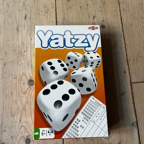 Yatzy spil med terninger fra Jeg ser 'Games for Fun' på emballagen.