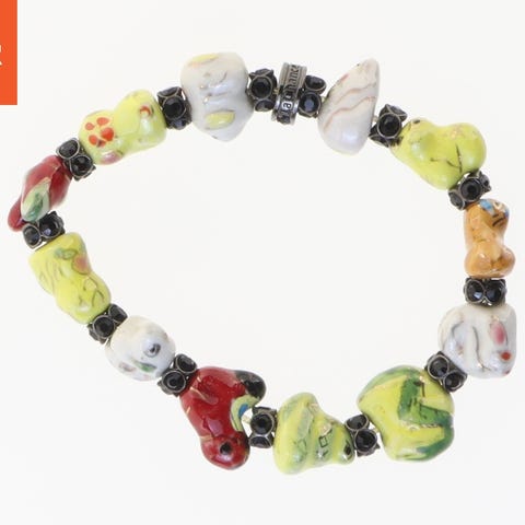 Dette er et armbånd lavet af farverige perler, hver dekoreret med blomsterdesign. Armbåndet har en diameter på 7,5 cm og består af flere perler i forskellige farver som rød, blå, grøn og mere, med blomstermønstre på hver enkelt perle. Det er elastisk og passer rundt om håndleddet.