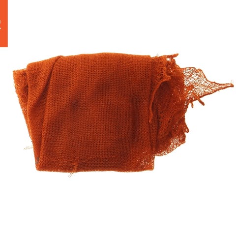 Kvadratisk, foldet lyserødt tekstil i størrelse 100x100 cm.