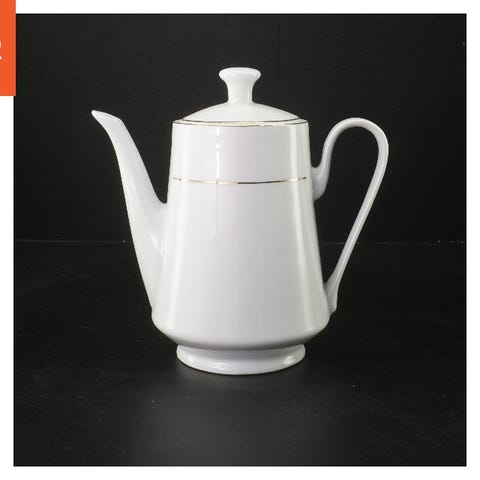En hvid porcelæn kaffekande med gyldne detaljer på tud, håndtag og låg. Der er en logo prægning på bunden, som kan indikere et mærke, men navnet er ikke læseligt.