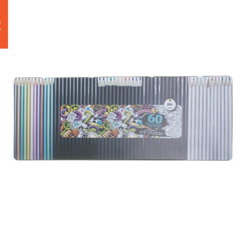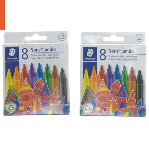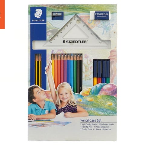 Et sæt af 12 farveblyanter fra Staedtler. Blyanterne er hexagonale og leveres i en farverig pakke med en pop art-stil. Pakken angiver, at blyanterne er nemme at spidse med standardspidsere og er sikre for børn over tre år. Størrelsen på pakken er 20,5x9 cm.
