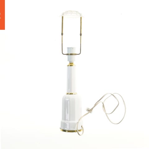 Denne lampe er en elektrisk model fra Philips. Den har en hvid base med diskrete guldtoner og en gennemsigtig skærm. Lampen bruger en elektrisk pære og er udstyret med en ledning og stik til tilslutning. Lampen er 48 cm høj.