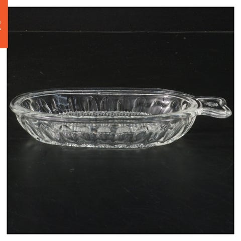 den er lavet af klart glas og har en bølget kant med et dekorativt mønster på bunden. Det er aflangt med et håndtag i den ene ende. Dimensionerne er 23x10,5 cm.