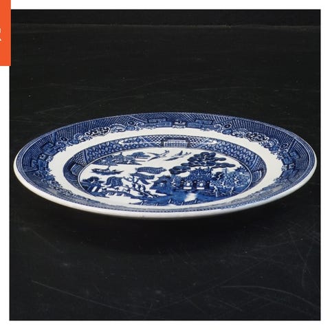 Sæt af 6 vintage tallerkener med blå og hvidt motiv. Størrelserne er Ø 18 cm, Ø 19,5 cm, og Ø 23,5 cm. Designet viser landskaber og har en dekorativ kant. Bagsiden af tallerkenerne har en producentmærkning, hvilket tyder på en engelsk produktion.