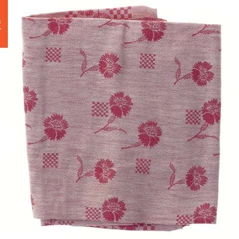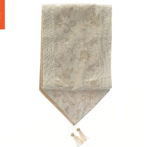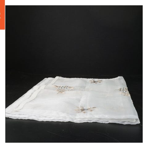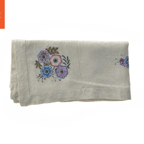 Denne genstand er et dækketøj med et detaljeret blomsterdesign i grå og beige toner. Det målte størrelse er 190x140 cm, hvilket gør det velegnet til at dække et større bord. Mønstret består af dekorative blomster og vine, med en yderkant af geometriske former. Stoffet ser ud til at være lavet af et holdbart materiale.