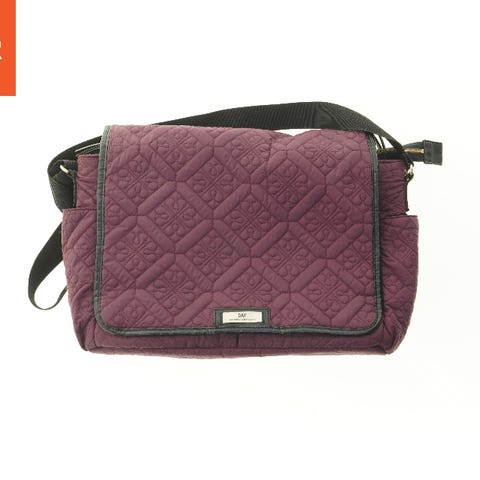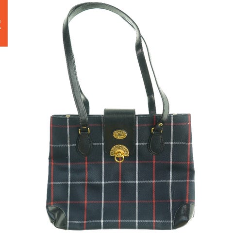 En blå taske med en indgraveret logo 'B' mønster på forsiden. Tasken har to kortere håndtag samt en justerbar skulderrem, hvilket gør den nem at bære på forskellige måder. Den har en lynlåslomme på bagsiden og en lynlås til hovedrummet. Tasken har guld farvede beslag og er ideel til hverdagsbrug.