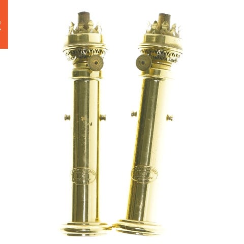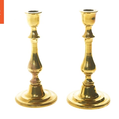 Sæt af tre koniske lysestager i guldfarvet metal. De har en høj og slank form med en bred åbning i bunden til at holde lysene. Der ses også et lille batteridrevet lys ved siden af lysestagerne. Størrelsen på lysestagerne er 20x30x37 cm.