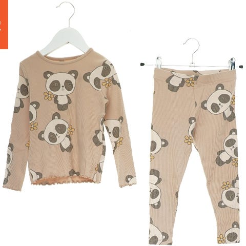 Sæt bestående af en langærmet trøje og bukser. Trøjen har et print af animerede hundefigurer og forskellige farvede symboler langs det ene ærme. Bukserne har et tilsvarende print af hundefigurer på det ene ben. Begge dele er lavet i en grå farve.