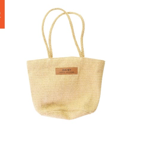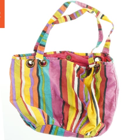 Denne taske er lavet af flettet materiale med en broderet overflade i en klar lyserød farve. Tasken har håndtag, også lavet af flettet materiale, og har en kant i en grønlig nuance. Broderede detaljer pryder taskens ydre. Taskens størrelse er 26,5x43 cm.