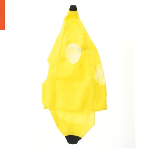 En poncho til børn med et pizzamotiv på forsiden, der viser peberoniskiver og ost. Bagsiden er ensfarvet orange. Ponchoen er formet som en trekant med rund halsudskæring.