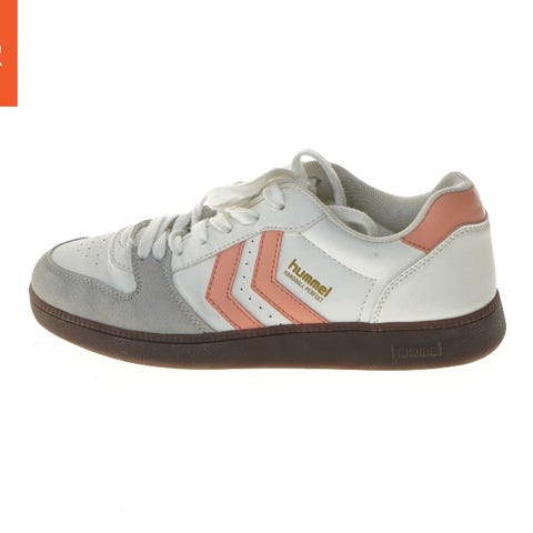 Et par damesko i størrelse 38, med snørebånd og flad sål. Skoene har et beige og hvidt design med lyse detaljer i lyserød og gul. Overfladen kombinerer forskellige materialer, herunder tekstil og syntetisk læder.