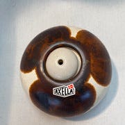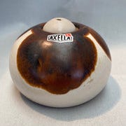 Denne genstand er en lille olielampe lavet af keramik med en glat, mørk overflade. Lampen har udskæringer, der giver et dekorativt udtryk. Den er designet til at holde en lille lys eller olie, som kan placeres i åbningen for at skabe en hyggelig belysning. Lampens størrelse er 8 cm i højden.