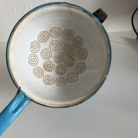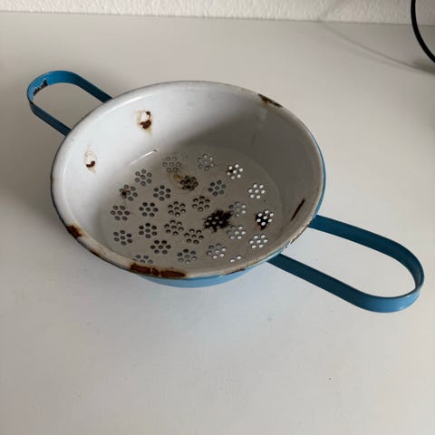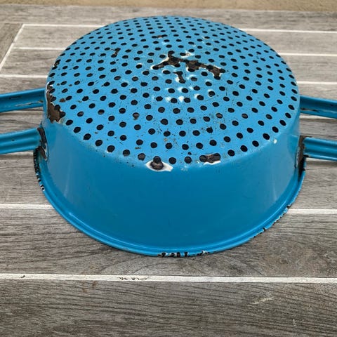 Denne genstand er en blå metal si med dobbelt håndtag. Den er lavet af metal og har små huller i bunden for dræning. Størrelsen er 19x7 cm. Den har nogle tegn på brug, som kan ses på billederne.