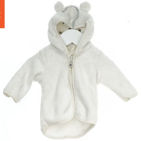 Jakke fremstillet i plysset materiale. Jakken har lange ærmer og en lynlås foran. Den har en hætte med små dyreører, hvilket giver den et sødt udseende.