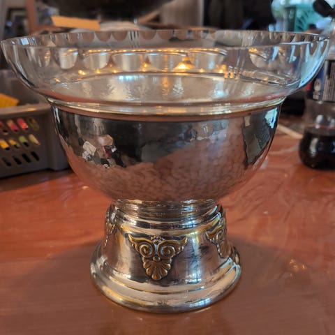 Opsatsen i metal er sølvfarvet på ydersiden og guldfarvet på indersiden. Det giver skålen et virkelig smukt skær.