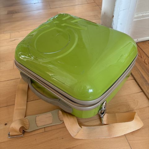 En brun læderkuffert med guldfarvede metaldele og låse. Den har et bærehåndtag og lukkes med låse på forsiden. Kufferten måler 44x31,5 cm.