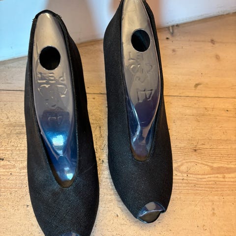 Sorte stilletter med en hælhøjde på ca. 8 cm, str. 41. Skoene har dekorative syninger og spids tå. Undersiden viser let brug, men ellers er der ingen synlige tegn på skader. Velegnet til formelle anledninger.