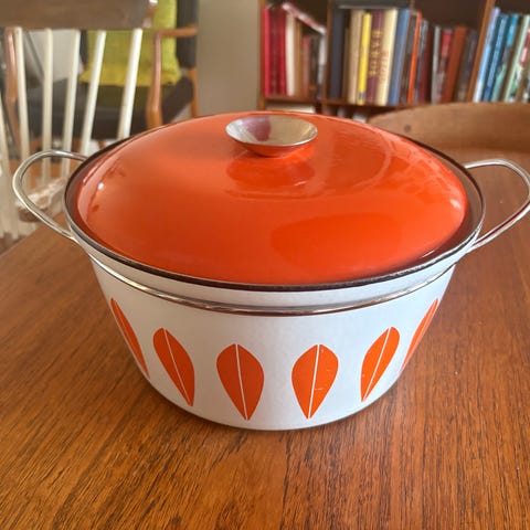 Lotus Lyngby gryde i stor størrelse med orange låg og det velkendte ikoniske mønster på siden. Gryden er i flot stand og har to håndtag og en diameter på 27 cm med en længde på 13 cm. Låget har en rund knop til nem åbning. Bunden af gryden viser tegn på normalt brug. Egnet til madlavning og servering af varme retter.