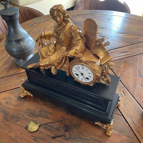 Mantelklocke af Samuel Marti, cirka 1850–1900, lavet af marmor og bronze med mekanisk ot-dages urværk, kvartslang slag hver halve time med klokke, fransk oprindelse, målene 40 × 12 × 20 cm, vægt 5 kg, opptiningsnøgle medfølger, i god brugt stand og i funktion, men kan kræve service. Klik på den blå "gå til varen" knap, for at købe eller byde på denne vare. Den samlede pris vil blive vist inden du afgiver dit bud.