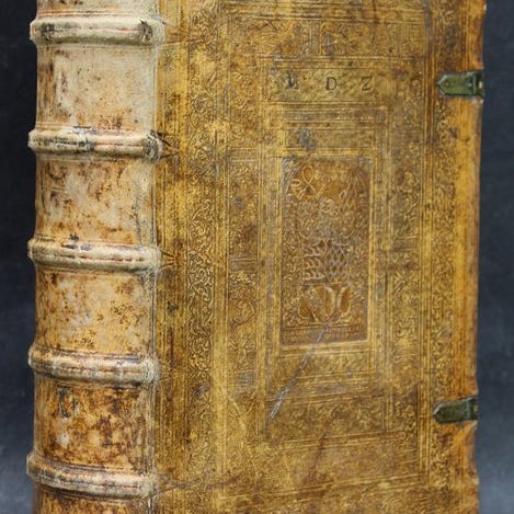 Martin Luther: Kolloquia eller Christelige nyttige Bordtaler Doctoris Martini Lutheri, som han i mange år holdt imod lærde folk og fremmede gestus og sine Bordfæller. Leipzig: Jakob Bärwald Erben, 1581. [42] 494 [29] Bl. 2°, blindpræget svinelæderbind over trædæksler med to intakte låse, med figurlige fremstillinger prydet.