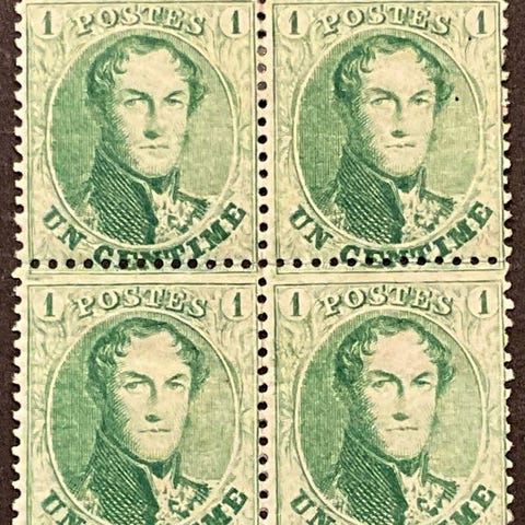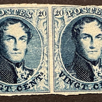 Belgien, Leopold I – Mønt med vandmærke uden, 1c grøn, par med bladkant, postfris (original gip), fra 1861, OBP/COB 9 i par. Klik på den blå "gå til varen" knap, for at købe eller byde på denne vare. Den samlede pris vil blive vist inden du afgiver dit bud.