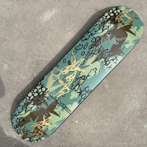 Her præsenteres det første værk i KAWS' debut-samarbejde; denne skateboard-deck-linje bærer ikke New York-kunstnerens xx-signatur, men i stedet et personligt design, der genskaber Box Logo i en tilsyneladende kalktegnet version, faktisk kaldet ‘Chalk Logo’.