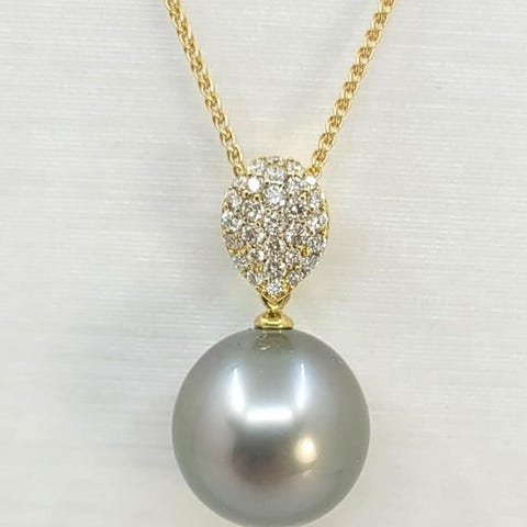 Vedhæng i gult guld og diamanter forstærker perlernes eksisterende farvetoner og fremstår magnificente!