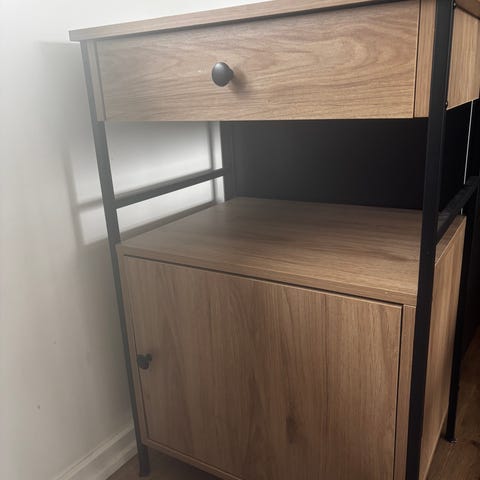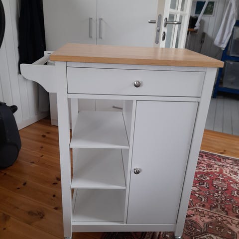 - Har 2 hylder og 1 skuffe med metalhåndtag