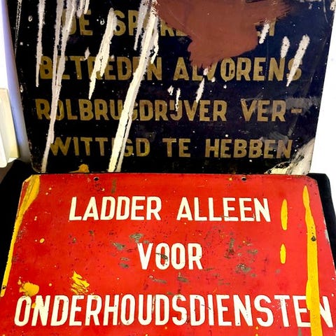 Gammelt emaljeret advarselsmærke, velbevaret vidnesbyrd over tid.