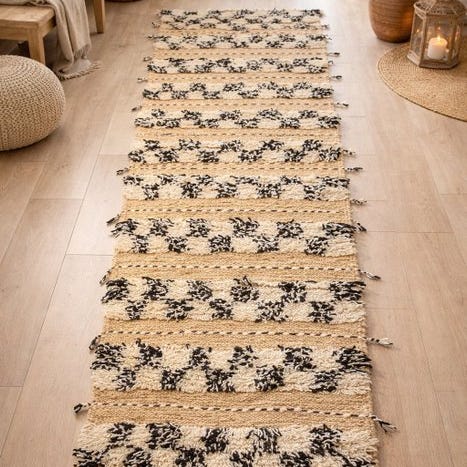 Bring varme og tidløs elegance ind i dit hjem med dette smukke Berber-løber. Den bløde elfenbensfarvede uld, kombineret med det karakteristiske sorte diamantmønster, giver løberen et roligt, men stilfuldt udseende.
