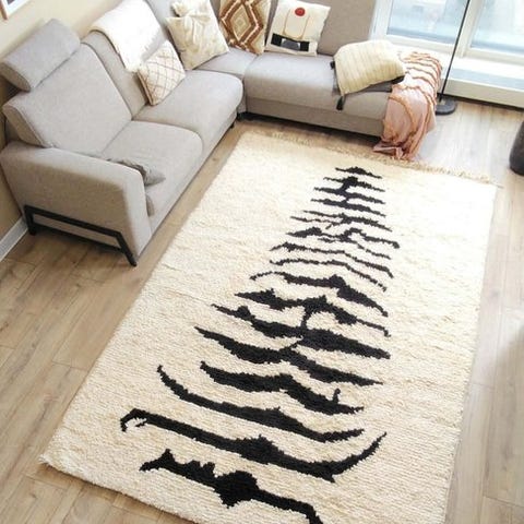 Hvert tæppe er unikt, lavet af 100% naturligt fåruld – blødt, stærkt og fuldstændigt bæredygtigt. Med sit moderne mønster giver dette tæppe et friskt blik på det klassiske Berberdesign. Mønsteret og formerne bringer harmoni og sørger for, at dette tæppe uden at tænke sig til straks fanger opmærksomheden hos enhver gæst.