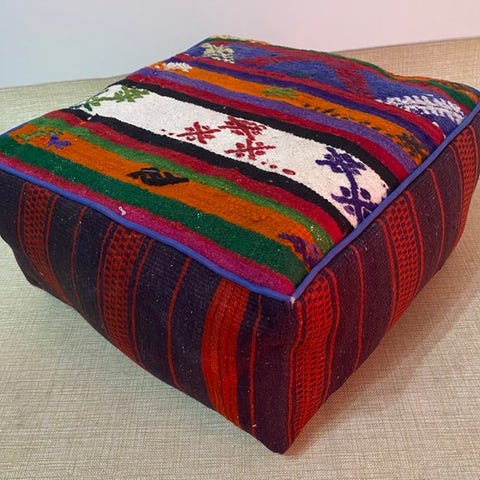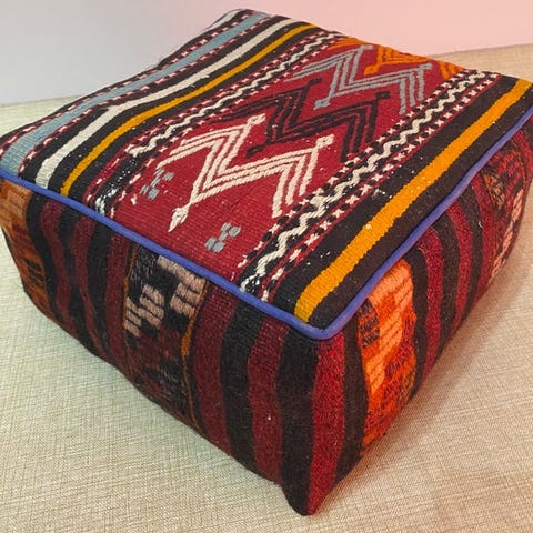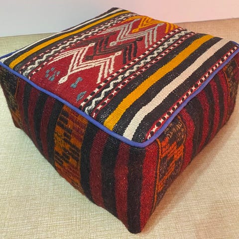 Vores puffer er et vidunderligt dekorativt produkt, som du nemt kan bruge i alle hjørner af dit hjem og din have. Størrelsen på puden er ca. 48 (bredde) x 48 (længde) x 25 (højde). Vores puffer er lavet af 100% ren uld fra gamle tæpper. Da de originale anatolske tæpper bruger naturlige farvestoffer og materialer, er hvert stykke unikt. Der kan ses forskelle i farver, naturlig slitage, asymmetriske mønstre og linjer – dette er naturen af gamle tæpper, hvilket gør dem unikke kun for dig. Vores puffer er håndlavede med den højeste kvalitet af syning, så du kan nyde dem i mange år. Det er op til dig at fylde den, du kan fylde den med skumstykke, formet skum, uld eller bomuld. Den sendes tom. Den