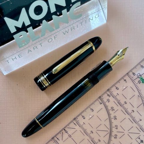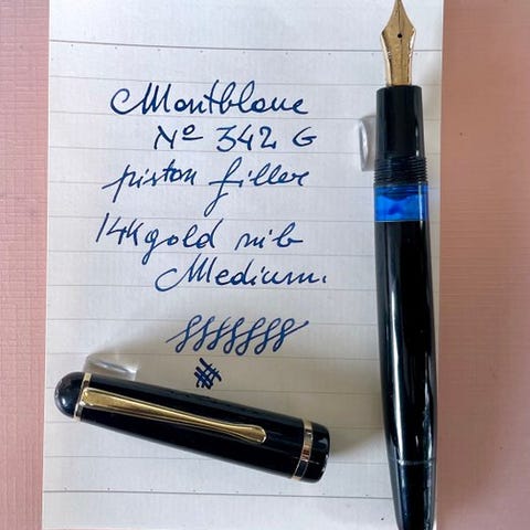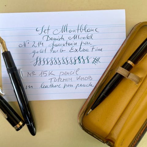 Mini fyldepen af mærket Mont Blanc, helt sikkert sjælden i original æske, aldrig brugt. Velegnet til en kvindes håndtaske, men også til en herre jakkelomme; den bruger standardblækpatroner. Længden er lidt over 11 cm og bredden lidt over 1 cm, den har usædvanlige dimensioner og er sandsynligvis foretrukket af den kvindelige bruger frem for den mandlige, selvom den lille størrelse gør den nyttig at have med sig.