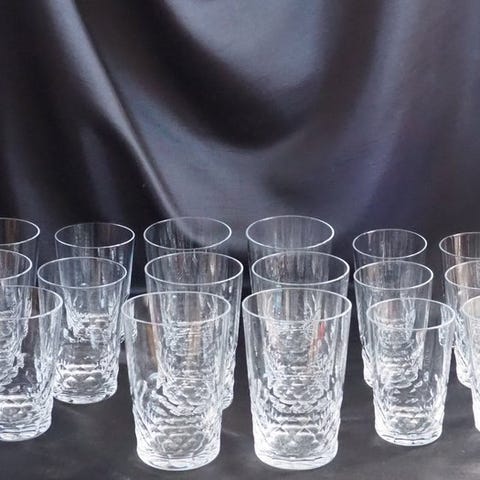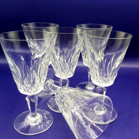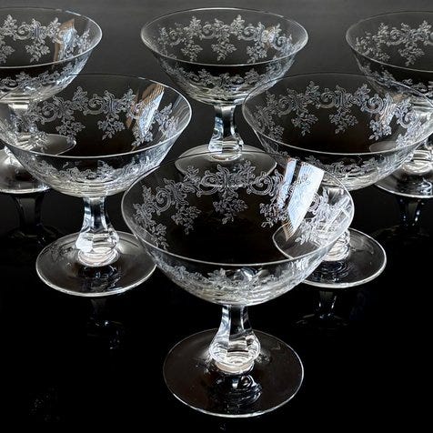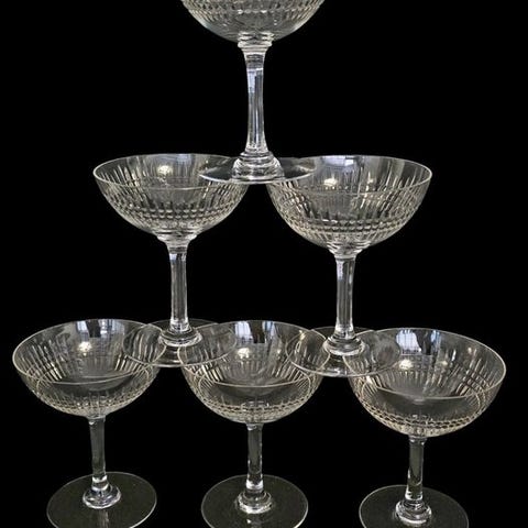 Serie på 6 champagneglas i skåret krystal fra krystalproducenten Baccarat, model Armagnac. Denne model, produceret i anden halvdel af det 20. århundrede, har et skællignende mønster, der smukt reflekterer lyset. Alle disse glas er mærket med et stempel "Baccarat" (se billeder).