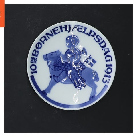 Dekorativ tallerken med et blå-hvidt motiv og påskriften 'BØRNEHJÆLPSDAG 1925'. Tallerkenen har en diameter på 13 cm. Bagsiden viser et ophæng til vægmontering og har inskriptioner fra Royal Copenhagen porcelæn.