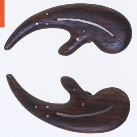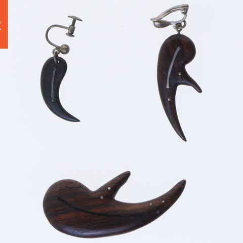 Smykkesæt bestående af to øreringe og en broche, alle lavet i mørkt smukt teak træ med et unikt, organisk design. Øreringene har forskellige lukkemekanismer: den ene med skruelukning, og den anden med en clipslukning. Brochen har en traditionel nål til lukning, der gør det nemt at fastgøre til tøj. Størrelsen på objekterne er 5,5 cm.