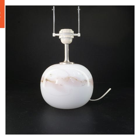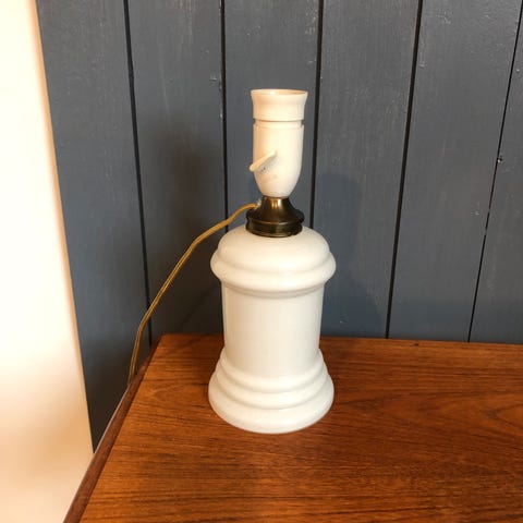 Bordlampen er hvid og har en højde på 40 cm. Den har en rund base og en skulpturel krop. Lampen er udstyret med en pære og en ledning med en stikkontakt. Der er en etiket på bunden med nogle tekniske oplysninger.