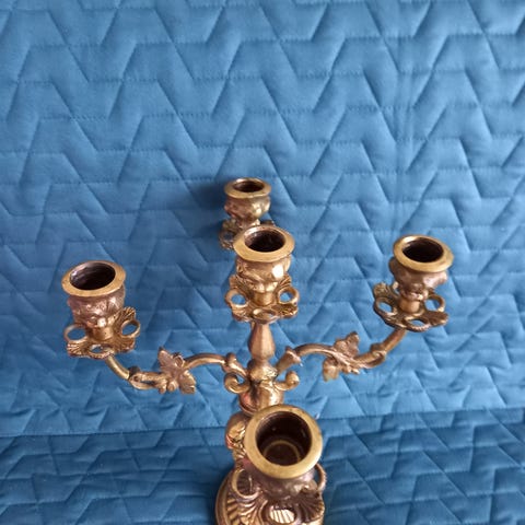 Denne messing lysestage har fire arme og en klassisk design. Den er lavet af metal og har plads til fire lys. Lysestagen er ideel til dekorative formål og kan bruges som midtpunkt på et bord eller som del af en indretning. Dens størrelse er 30x23 cm.