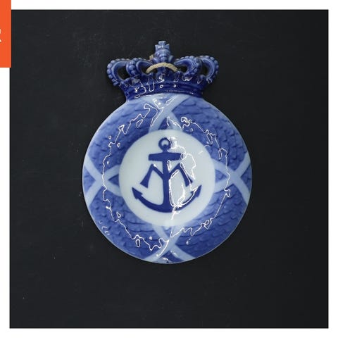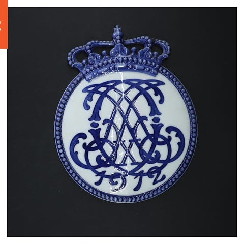 Porcelænsplakette med krone og blå dekoration fra Royal Copenhagen (str. Ø 19 cm
