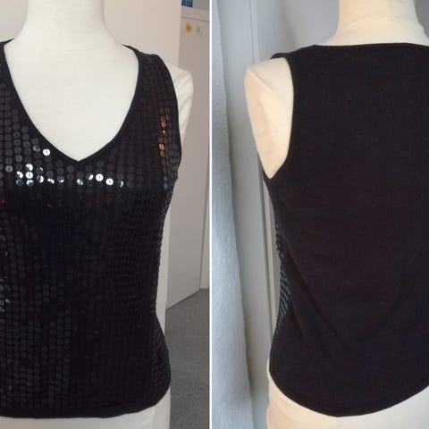 Pragtfuld fest/cocktailkjole til kvinder. Kjolen er sort med skinnende overflade og tætsiddende pasform. Ærmeløs model med rund halsudskæring og kort længde. Foret indvendigt for bedre komfort. Velegnet til festlige lejligheder som fester og cocktailarrangementer.
