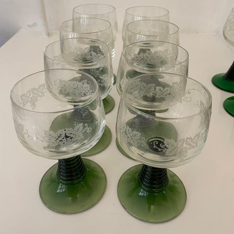 4 af hvidvinsglassene er med ét mønster og 3 med et andet mønster