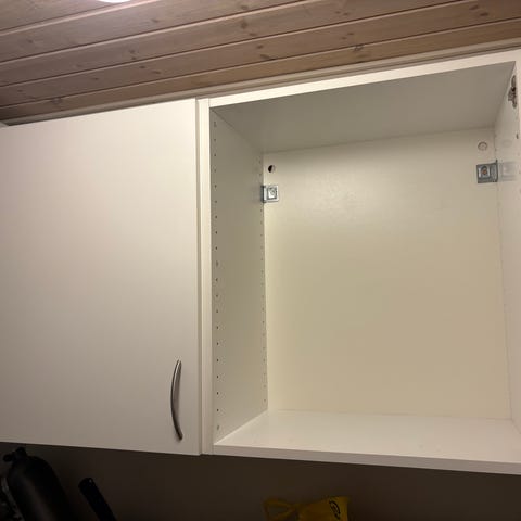 Skabene har glatte hvide låger og der har ikke været monteret håndtag. De har været anvendt til opbevaring og har meget lidt slid.